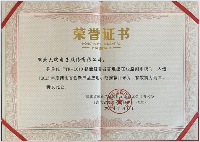 经天门市经信局推荐、行业专家审查评估、联席会议审定,天瑞电子公司“TR-LC10型智能雷电流在线监测系统”产品入选2023年度湖北省创新产品应用示范推荐目录。